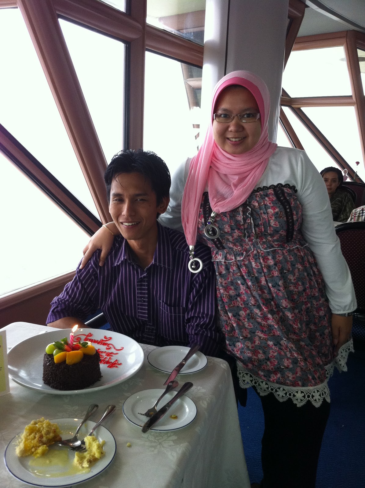 On Thursday, a couple of days before his birthday, i suddenly felt kinda guilty for not doing or planning anything for him. So I googled and search for a so called romantic place to dine in with all the candle light dinner bagai sume la kononnye.. read few forums and mostly in the forum mesti ada suggestion untuk try KL Tower Revolving Restaurant (Restoran Berputar). From the review, mostly said the foods are so-so, but because as a pure KL breed and haven’t been to KL Tower (org KL biase pegi lambat2, bg chance kat org luar visit dulu…hoho), i decided to have a lunch there and booked through phone je.
