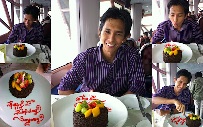 There were two sections where the food were served. One for malaysian’s foods and another section for western/fusion kind of foods. However, the choices were limited though. The taste for me?..so-so je.. boleh la makan…takde la kate tak sedap sgt.. When Dude went to take some food for the second time, i signaled on of the waiters to bring the cake as the pianist had arrived. So when dude came back to his sit, the pianist make an announcement wishing Dude happy birthday and just on that instant, the waiters came to our table with a cake singing happy birthday song for Dude diiringi dengan petikan piano (bukan petikan for guitar ke?..huhu) by the pianist. They sang it twice and Dude just went ‘Awak….awak…awak’ sambil sengih2 menahan malu dan bangga, maybe?..hohoho