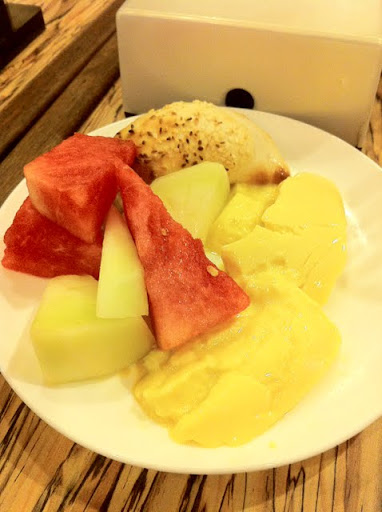 Ade fresh fruit, ade roti yang lembut & basah2 dalam dia yg aku tatau apekebende tu, dan yang paling sedap ada macam puding. Tatau juge dibuat dari apa. Macam puding karamel, tapi sedap gile nak mampus!!.. Kalau ikut napsu, satu dulang tu aku dah amek makan sorang. Tapi tengok perut sendiri sambil ingat kat Kevin, aku makan ape yang ade dalam pinggan tu je..sikit kan? Ishkk.. (^_^)